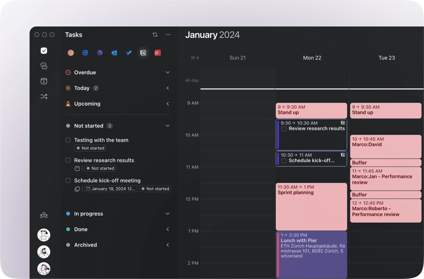 Connect Notion, Linear, ClickUp, Todoist, and more to import tasks from a mix of sources into Morgen. Alternatively, creative tasks in Morgen. These tasks can be dropped into the calendar for easy time blocking or scheduled with the AI Planner. Get notified when a task was left incomplete to optionally reschedule it.